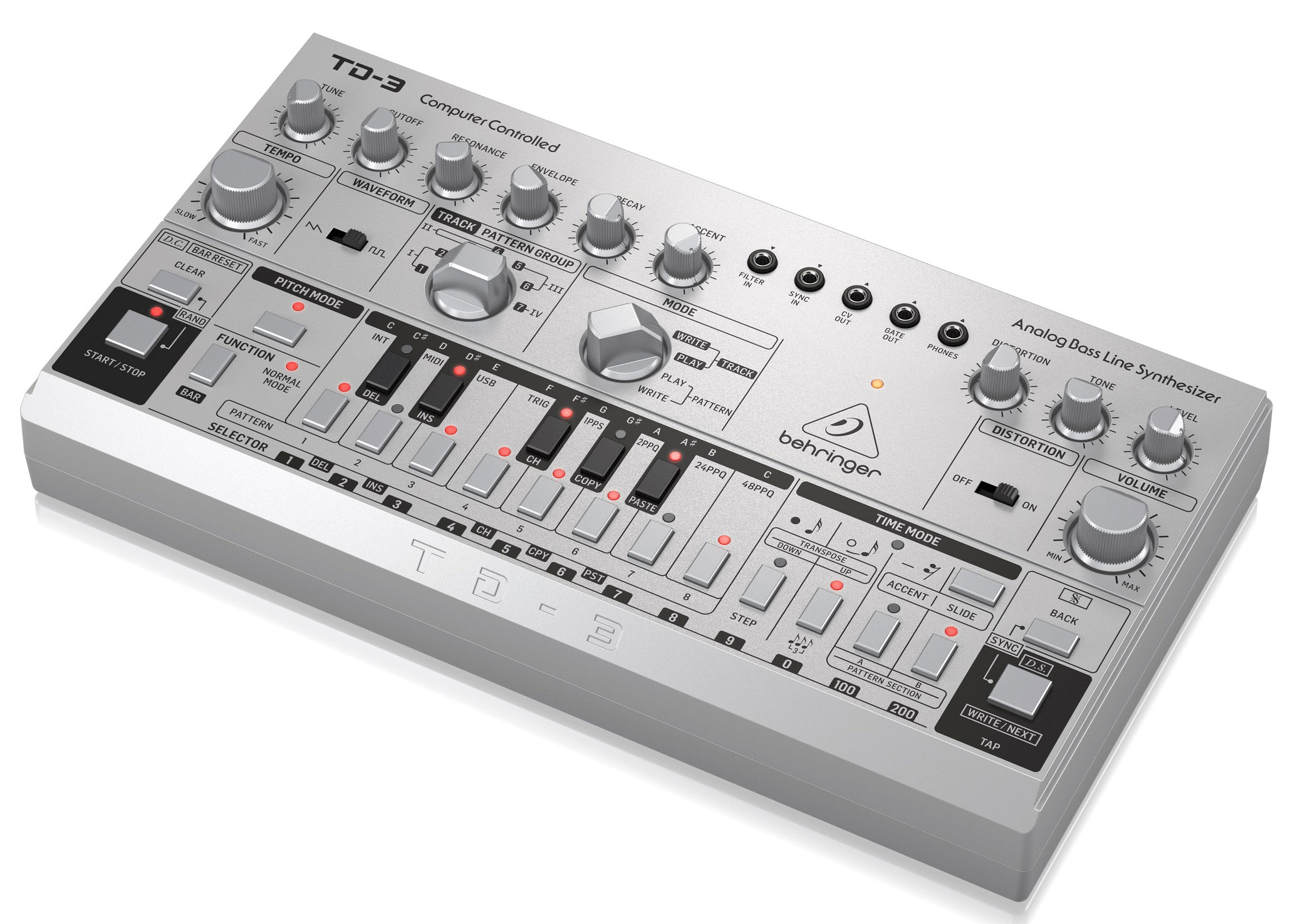 Басовый аналоговый монофонический синтезатор BEHRINGER TD-3-SR - клон легендарного Roland TB-303. В отличие от именитого предшественника, синтезатор имеет встроенную схему дисторшна, основанную на педали Boss DS-1, и поддержку MIDI/USB. Синтезатор полностью воссоздает схему VCO, VCF и VCA оригинального устройства и оснащен 16-ступенчатым секвенсором.
